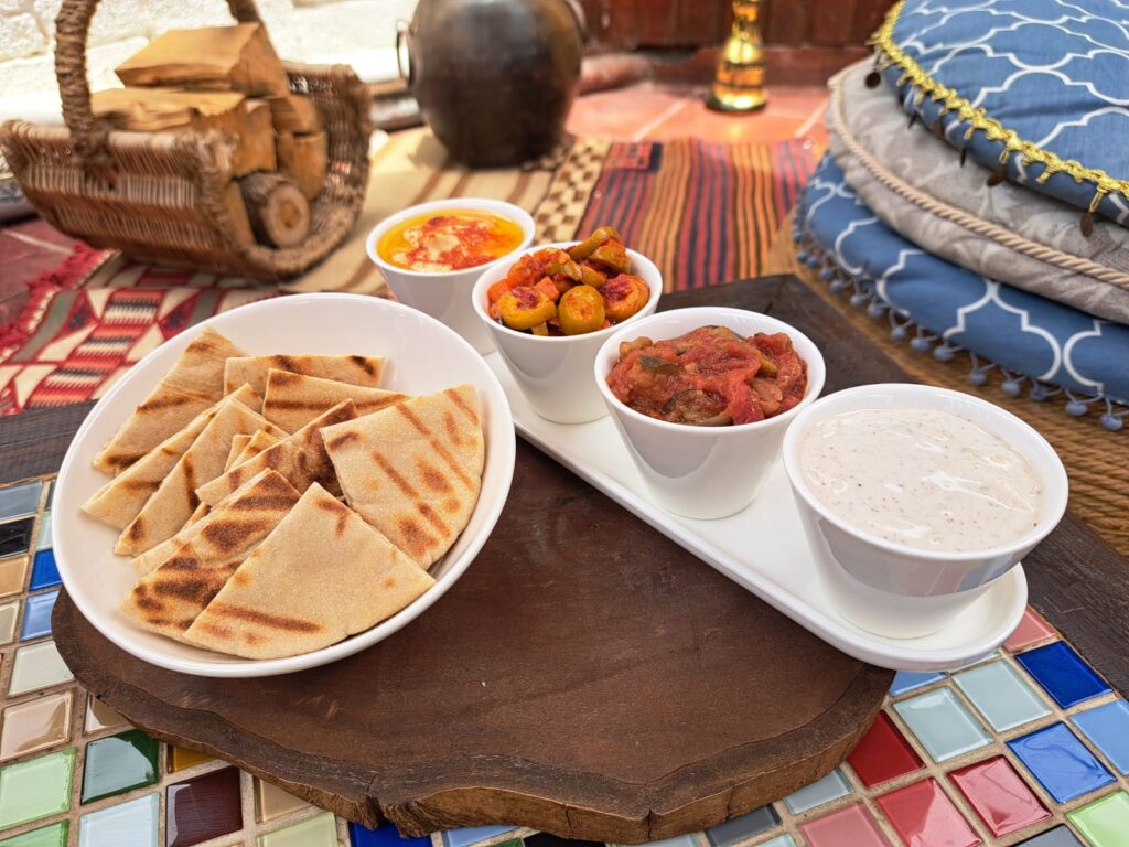 Aquí se invita a descubrir y los ingredientes son clave: aceitunas, especias, pasta de tomate, té y café son en su mayoría importados, mientras que los productos frescos se compran a diario en la zona, garantizando calidad y frescura.