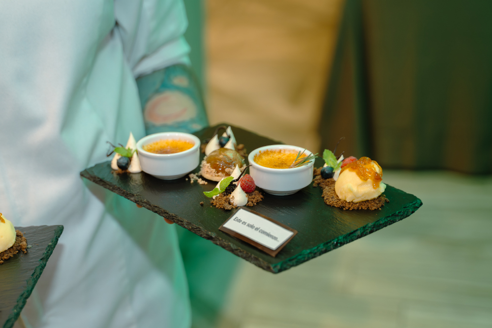 Los fondos profundizaron en esta narrativa culinaria con un tradicional coq au vin, pollo cocinado lentamente en vino tinto, acompañado de un puré rústico, junto a una merluza austral en costra siciliana, que incorporó matices mediterráneos en equilibrio con el producto local. El cierre estuvo marcado por una degustación de postres, donde destacaron un dúo de crème brûlée y un apple crumble con helado de vainilla, en una propuesta que buscó coherencia de principio a fin.