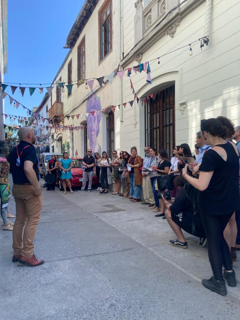 El recorrido se inició en Casona Compañía, frente a uno de los murales emblemáticos del Barrio Yungay. En este punto se presentó el enfoque del proyecto Santiago Urbano y la propuesta Santiago Expresa, a través de la experiencia Murales que hablan, destacando el valor cultural, urbano y social del sector.